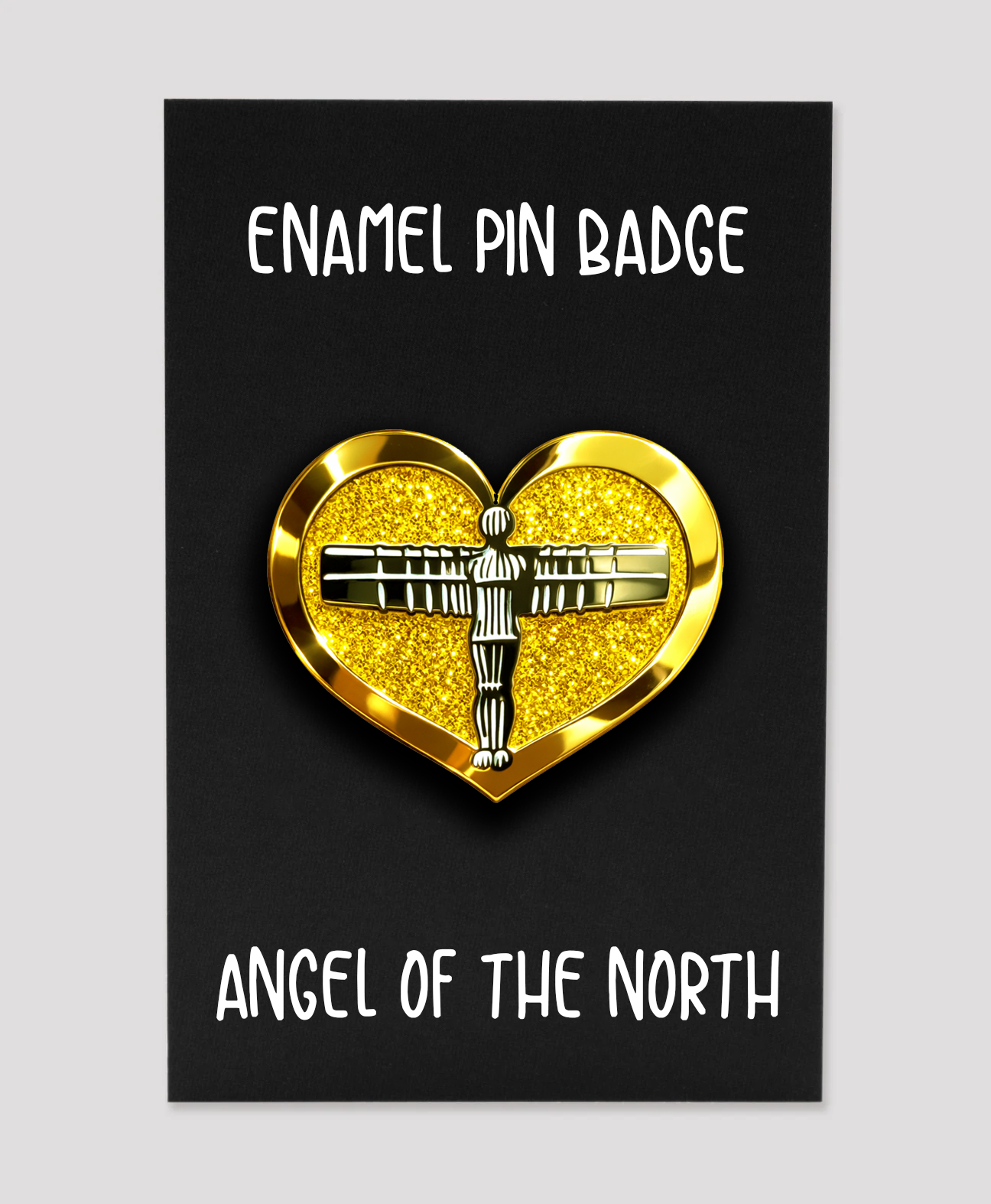 A shining tribute to the North East, this Angel of the North enamel pin features a bold gold glitter heart with the iconic silhouette at its centre-eye-catching, meaningful and full of regional pride.